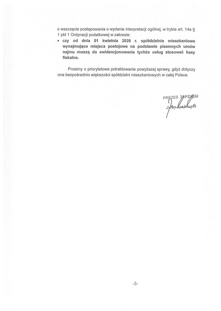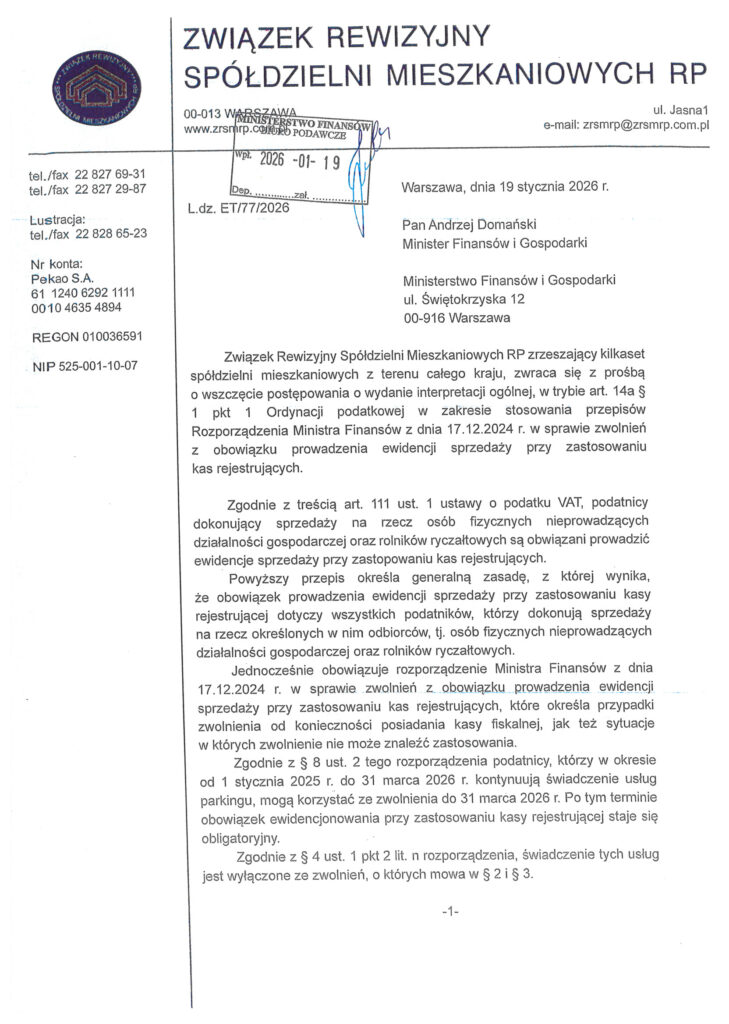 Pismo ZRSM RP z dnia 19 stycznia 2026 r. skierowane do Ministra Finansów i Gospodarki dotyczy wniosku o wydanie interpretacji ogólnej przepisów prawa podatkowego w zakresie stosowania kas rejestrujących przez spółdzielnie mieszkaniowe.